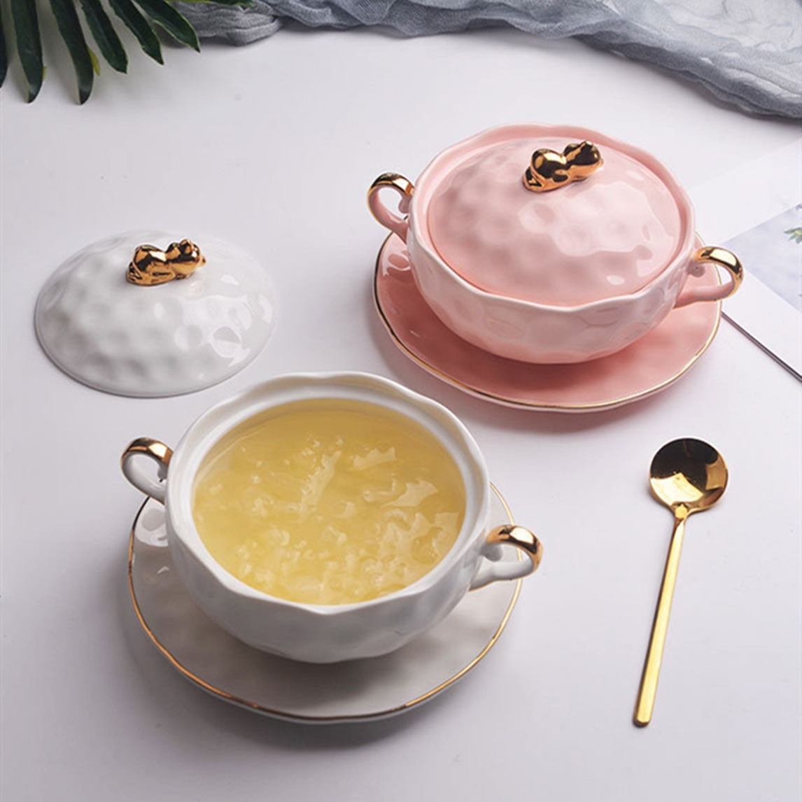 欧式带盖描金双耳碗,简约大气,富有艺术感,盖子采用金猪镶嵌,美不胜收,装甜品、蜂蜜、酸奶都是不错的选择。