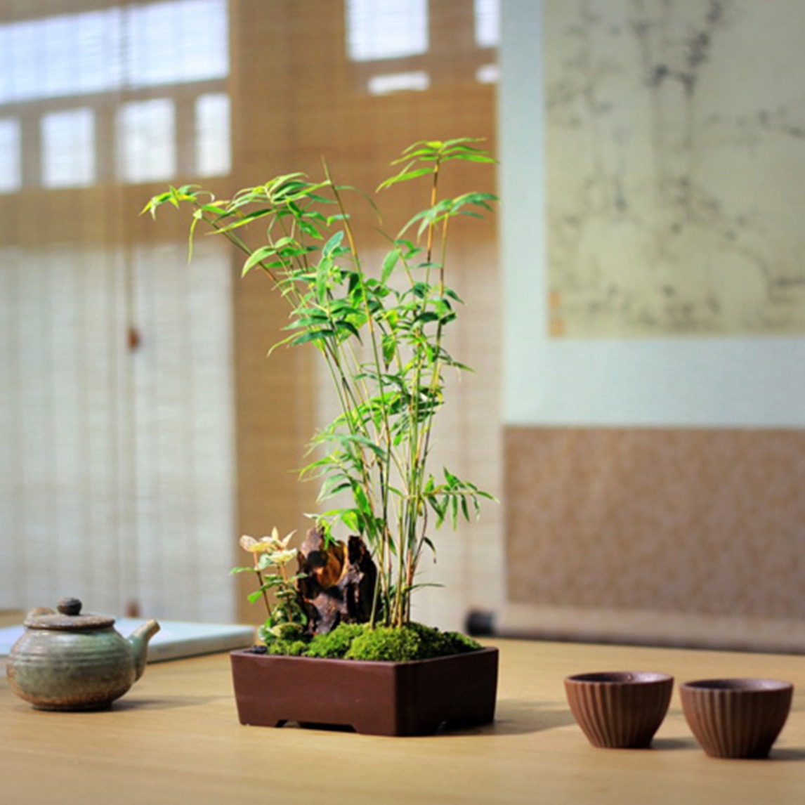 端庄大气的四方形紫砂花盆,尽显浑厚细腻的儒雅气质,用来养植青竹,辅以苔藓、假山点缀,返璞归真,带有浓郁的人文气息。