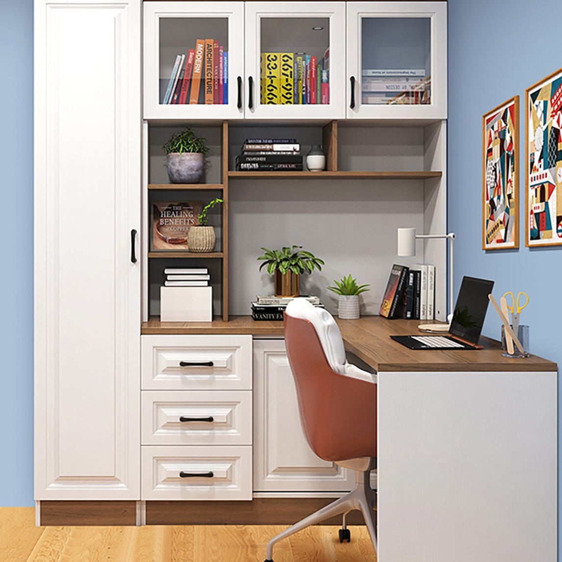 儿童书桌连体组合衣柜,立体空间感十足,在空间美感的基础上,实用性也是一应俱全,放置衣物,学习娱乐,让孩子从小规划自己的穿搭学习,在配上一些绿植,净化空气,也减少电脑带来的辐射。