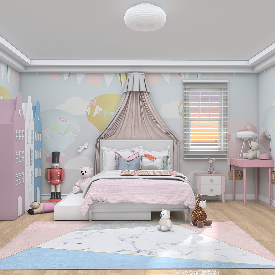 家中女孩的儿童房,最喜欢粉色空间,温馨可爱的氛围,让小孩安然入睡;白色的吸顶灯光线柔和不刺眼。配上彩色的装饰画,更显舒心。