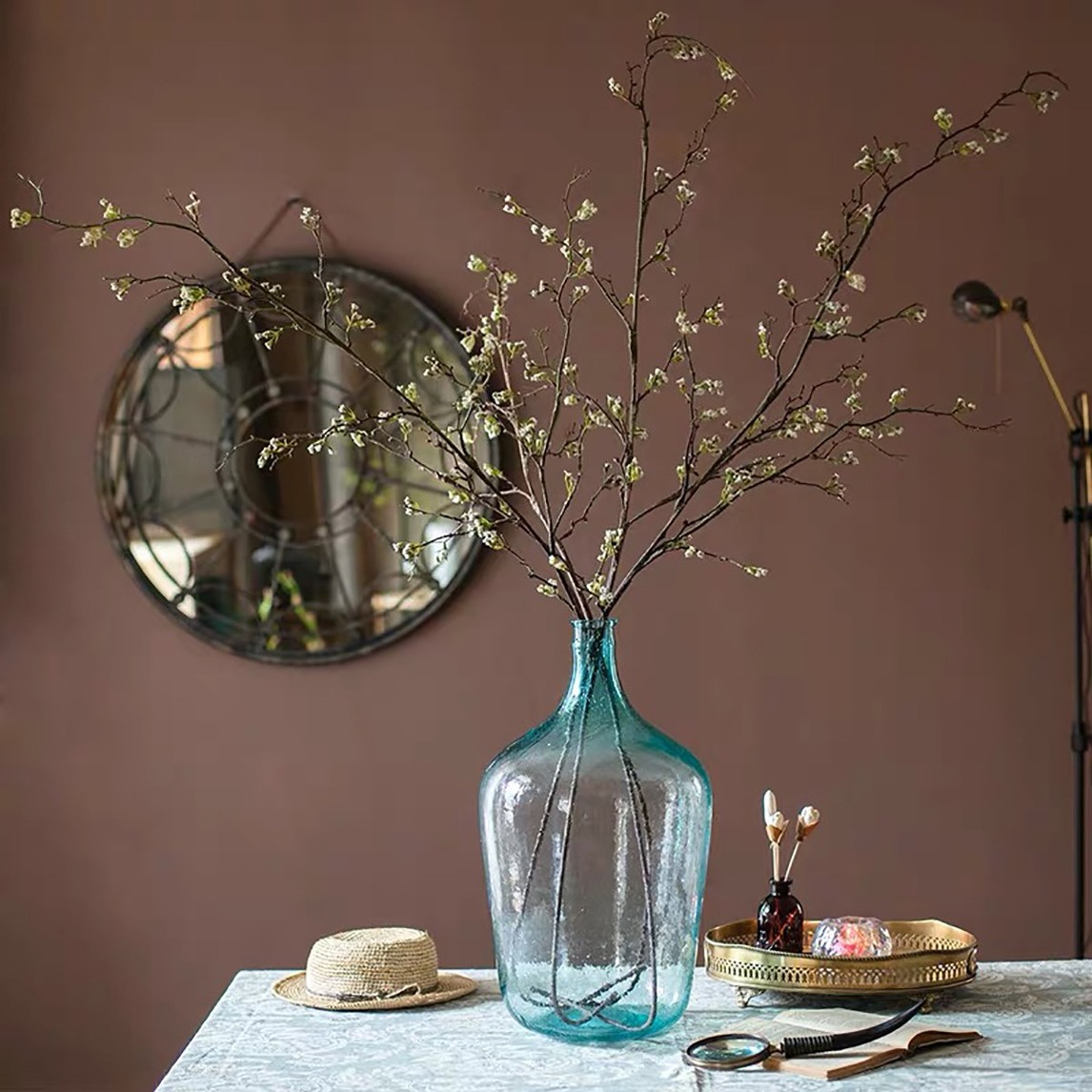 一如静物画般的美好餐厅,大型的手工花器与碎花枝搭在一起极为经典,唯美中还有一丝禅意,是让人心境平和的家居摆设。一侧墙壁上的镜子,如花窗般的设计,让整个空间更通透灵动起来。