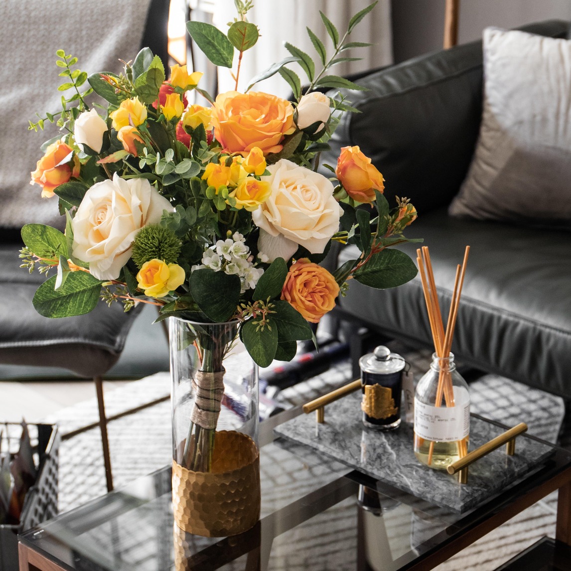 整体是暗黑色系的轻奢复古风家居风格,可以用亮色系的花束来中和。阳光治愈的晴诗仿真花束,搭配透明金边的玻璃花瓶,低调又不失优雅。