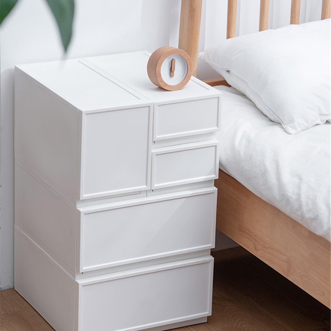 这种可以自由组合的收纳箱,可谓是相当实用了,大小不同的款式组合在一起,也是可以取代床头柜的,创意拼接设计,拼装时也比较省力。