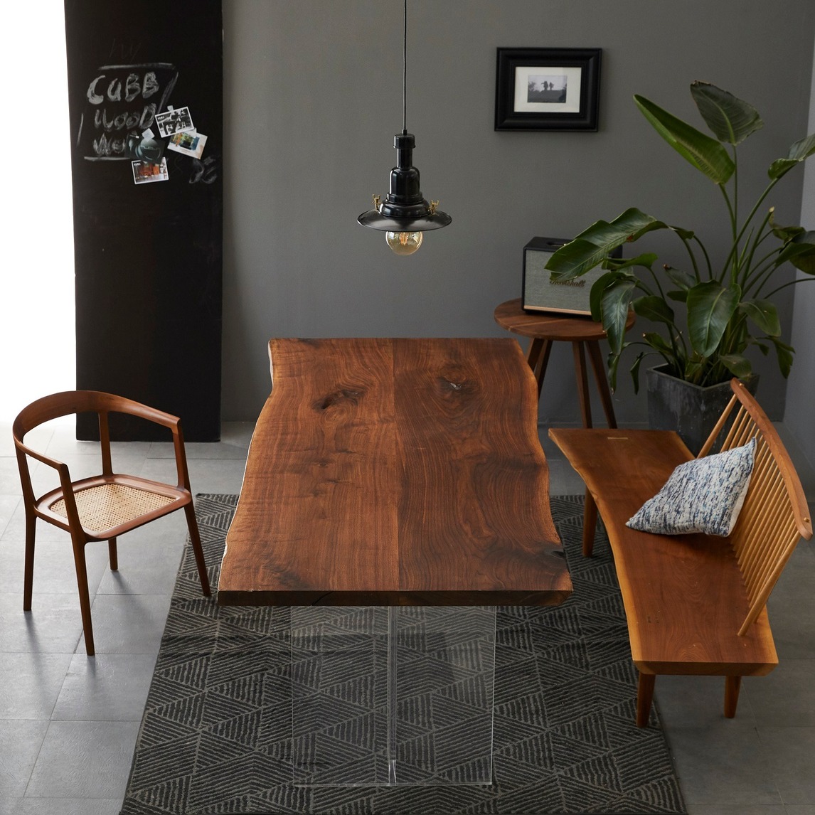 美式工业风给我们的一贯印象是粗犷的 而这个餐厅设计师选用主材却是精致细腻的美国黑胡桃 从双拼的黑胡桃餐桌面 到黑胡桃藤编餐椅,靠背长椅,小茶几 搭配深色系的地毯,水泥地面和墙面 吊灯和挂饰也采用黑色元...展开