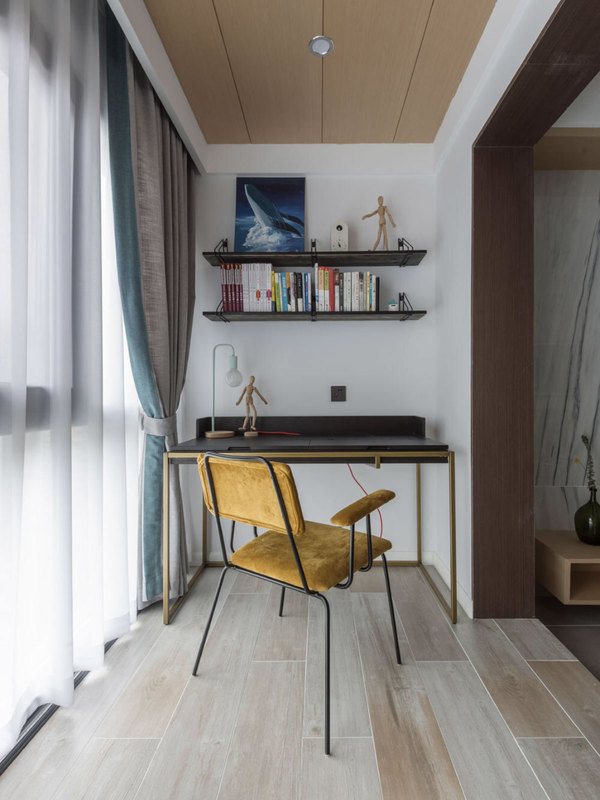 巧妙的利用阳台空间为自己打造一个美观时尚的学习区域,纯实木地板清新的纹理环保健康,轻奢电脑桌简约时尚,光滑的桌面易打扫,马卡龙台灯小清新的色调晚上学习不伤眼,墙上置物架美观不占地方,拼色窗帘提升房间质...展开