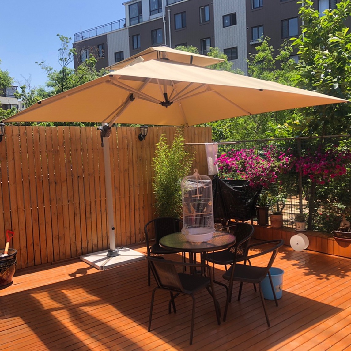庭院采用木纹地砖,打造出充满田园风的空间效果,各类花草的摆放错落有致,为了能更好的便于休息放松,在庭院的内围还摆放了桌椅、太阳能遮阳伞等物品,实用舒适。