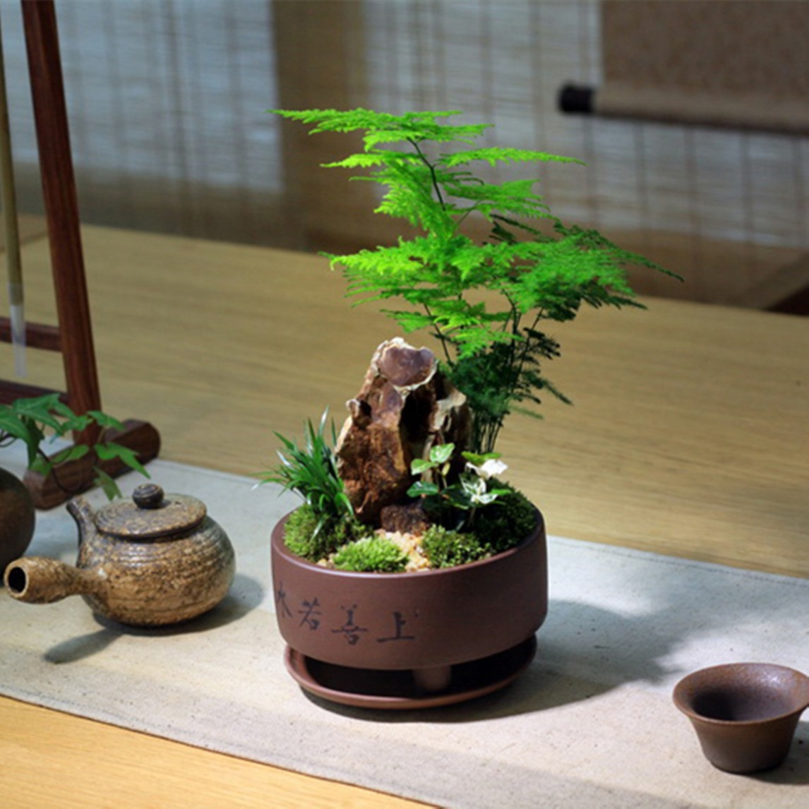 以色泽典雅的紫砂花盆,辅以苔藓、菖蒲和怪石点缀,营造出主体植物文竹倚山而植,如松立石壁,非常有意境,很适合用在新中式书房之中。
