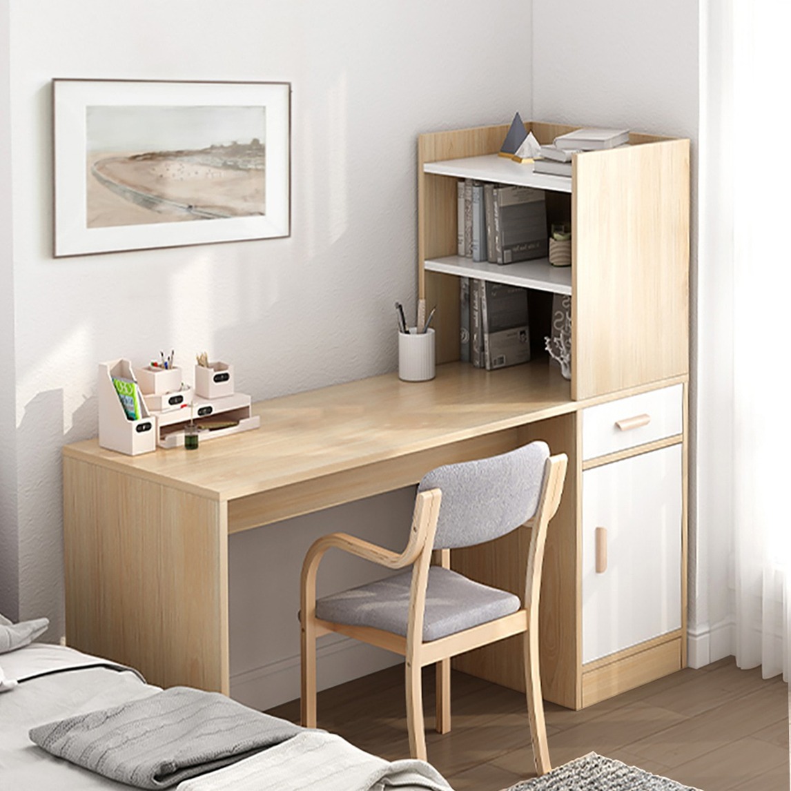 选择极简主义的实木款书桌,搭配多层收纳书架书柜,满足日常生活的书本和装饰物收纳需求,彰显北欧自然舒适惬意感