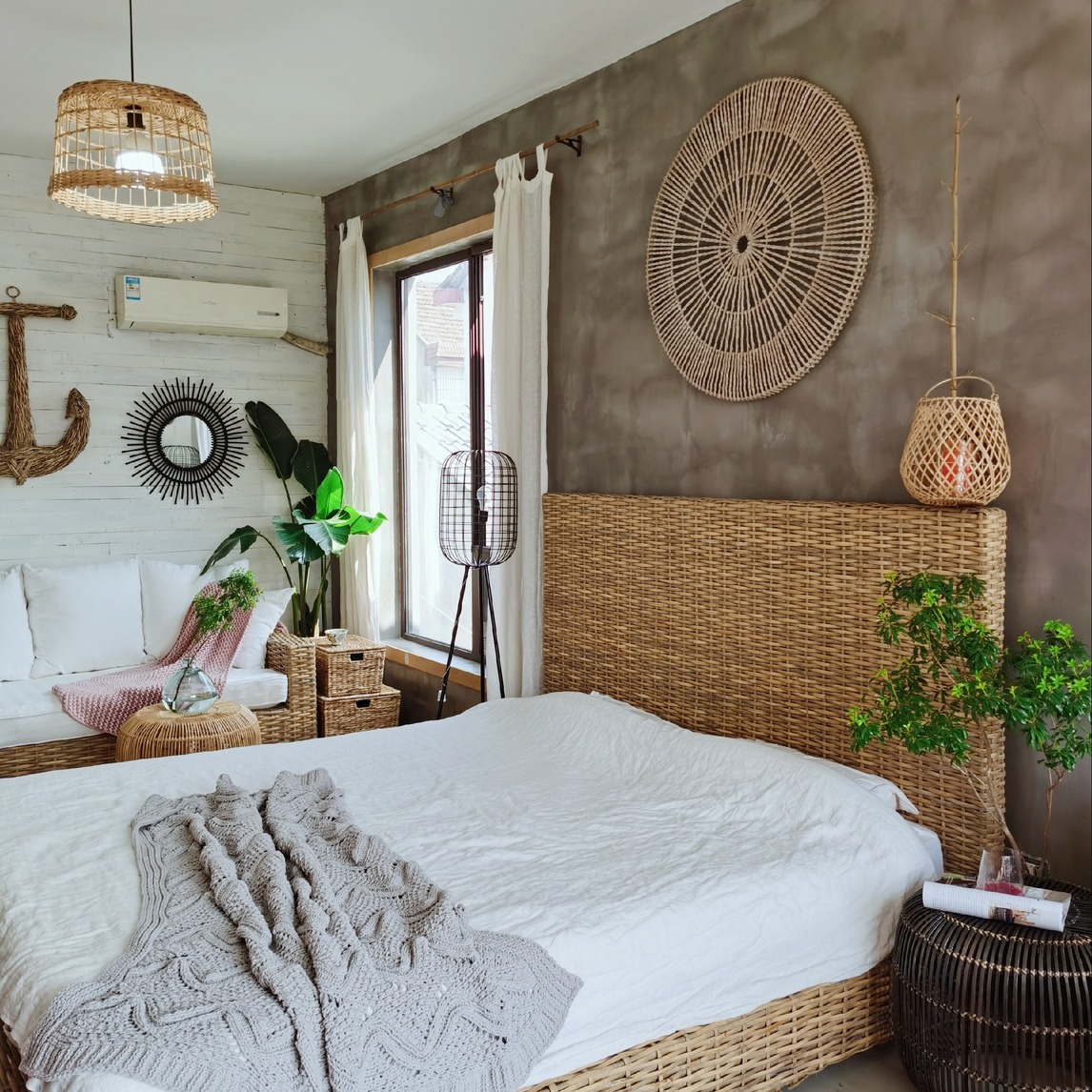 沉迷水泥的原始粗犷,但不乐于它的工业冰冷。卧室要诗意个性也要安静温馨,运用了自然的大地色和绿色与之调和。一张藤编床透着慵懒放松;光影从几盏编织灯中穿透,摇曳着慢时光;天然壁饰打破墙面的空旷与单一。工业...展开