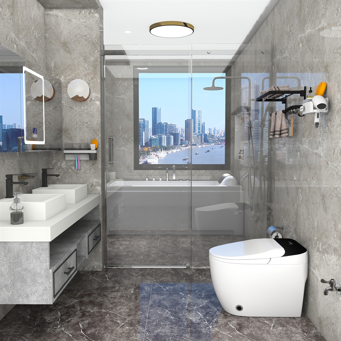 现代的卫生间,金色分子灯提供照明,卫生间采用干湿分离的设计,将如厕和洗浴很好地隔离开,灯光足够,且不会感到太亮太刺眼,柔和有助于保护人们的眼睛。