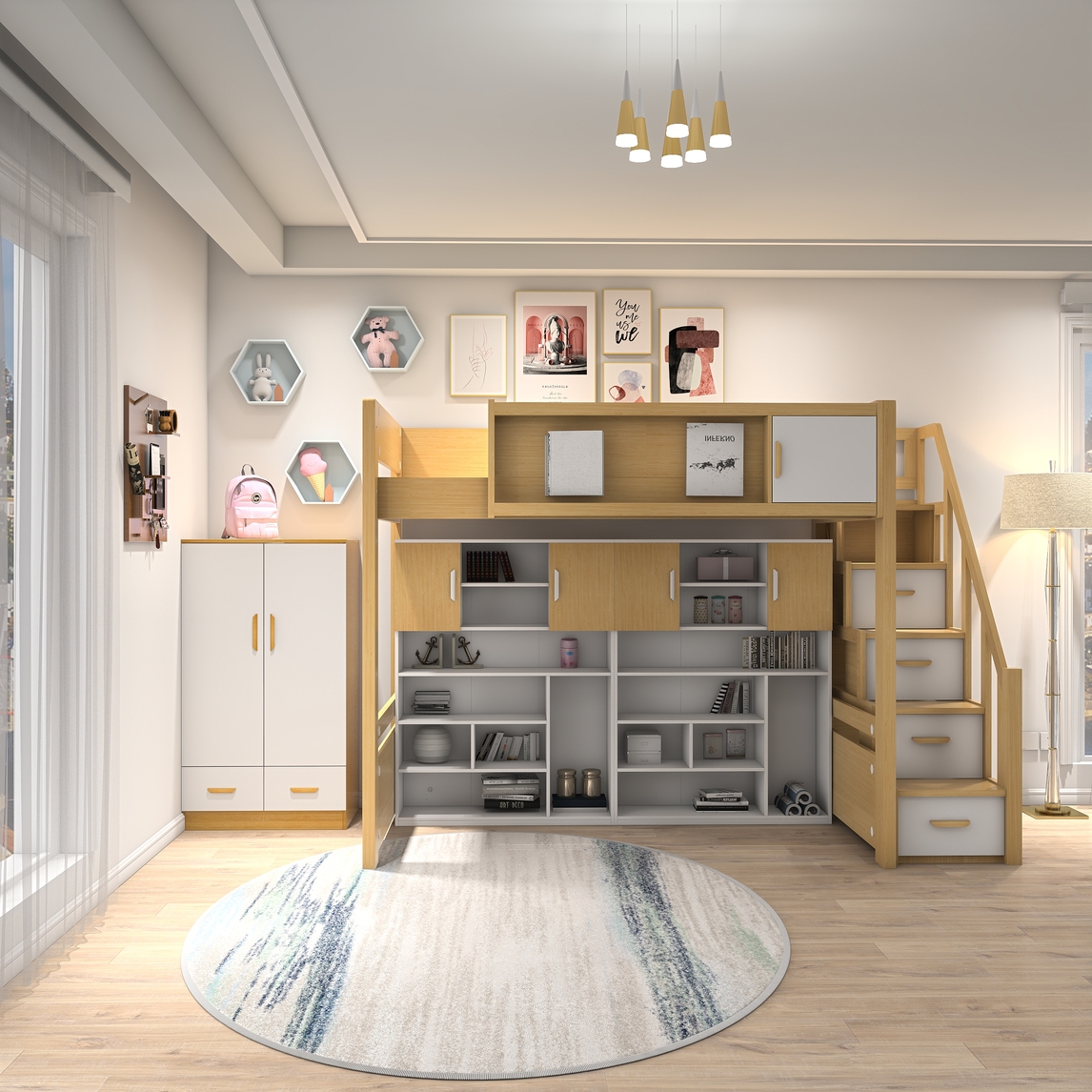 此次设计针对空间有限,为了满足又能休息又能储藏。就把书柜和床的以组合的形式,上床用以睡觉,下面做成一个小型书柜,增加整个空间的储藏功能,可以选配一个衣柜,更方便衣物的存取。侧边有个梯柜是个亮点,梯柜下...展开