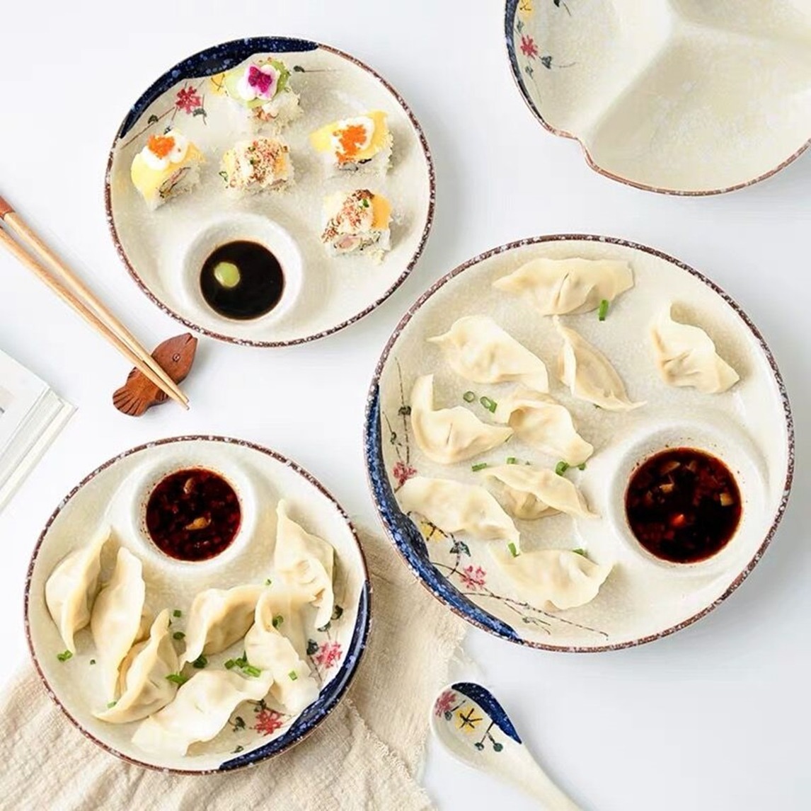 雪花凌梅日式寿司盘,手工绘制,高温釉下彩,碟盘合二为一,化繁为简的一体化设计,用来盛放寿司、玉子烧等美食,甚是好看。
