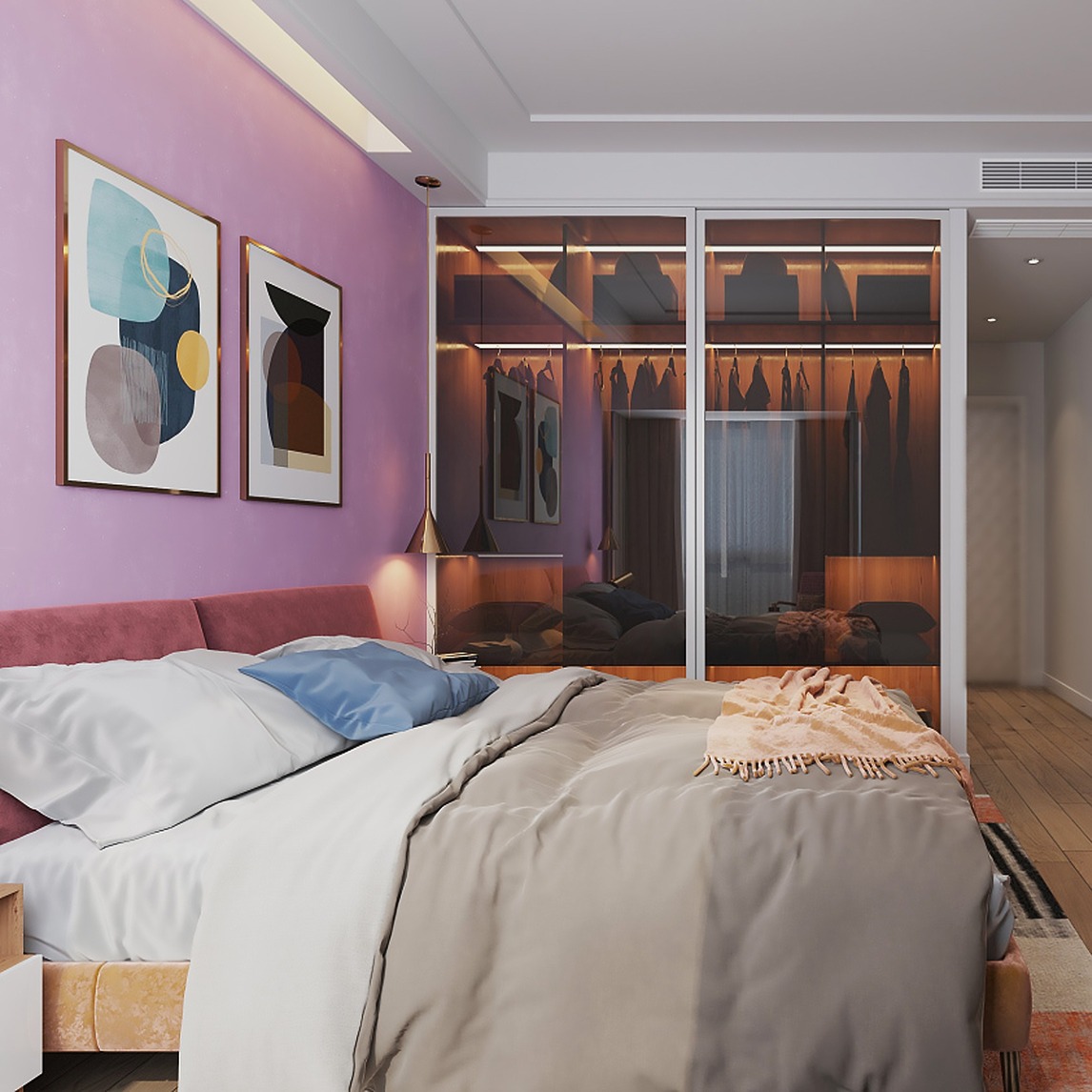 室区域,不论是色彩的搭配、家具的造型都以现代简约为基础。靓丽而柔和的色彩,舒适而具有腔调感的家具及装饰品,色彩与材质的搭配尤为重要。