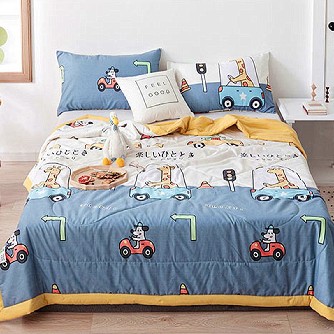 给孩子一个舒适的房间,要从床品开始,蓝白相间的卡通四件套,很符合孩子的气质,活泼可爱,充满了童真,柔软舒适,伴孩子健康成长。