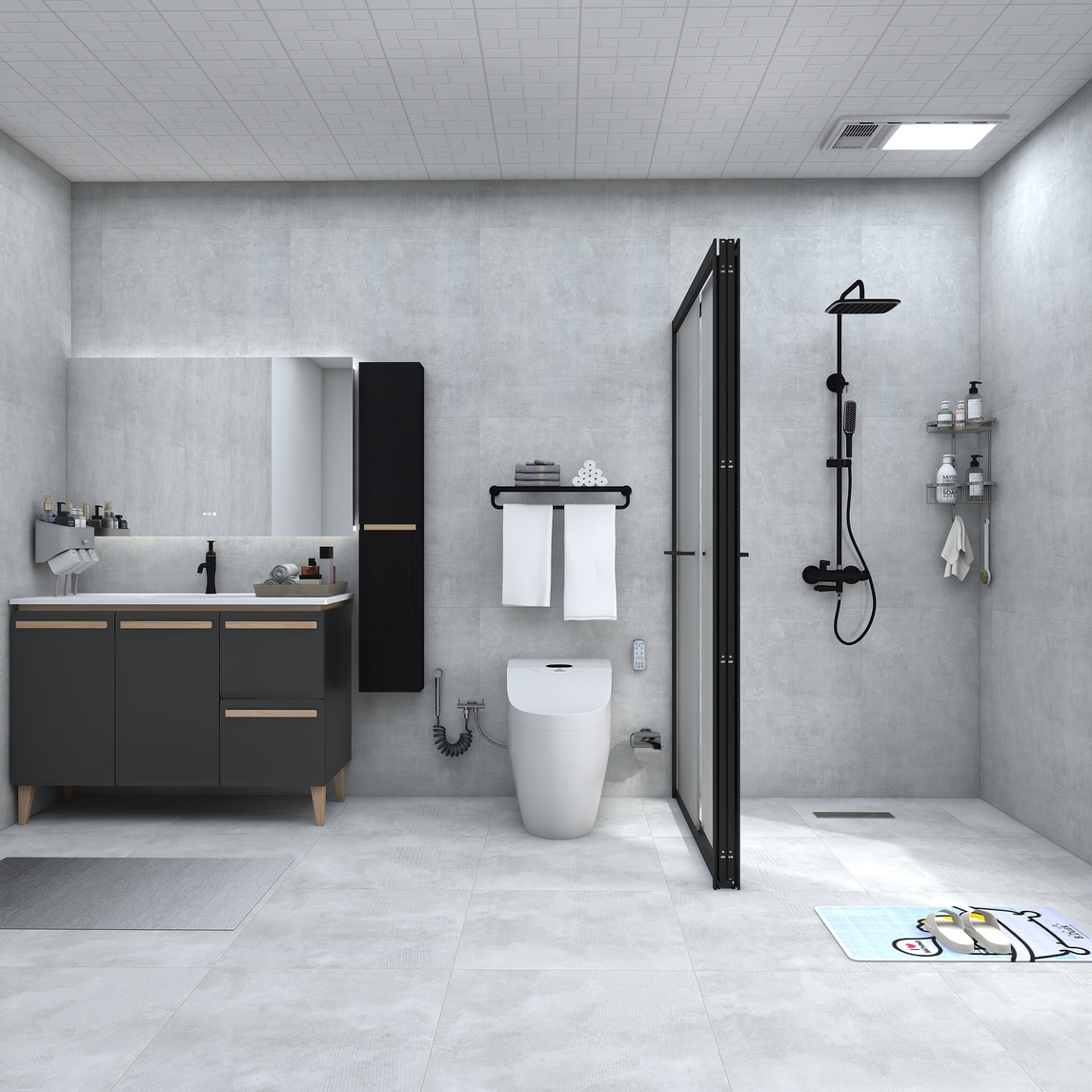 极简工业风的卫生间,给人以干净、明快的视觉效果,搭配黑色金属卫浴五金,高颜值实用花洒,方便实用的智能卫浴,营造出简约有范的工业风卫生间。