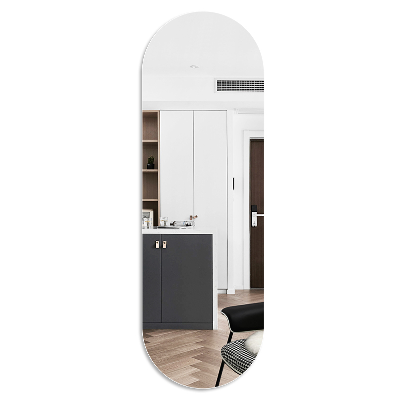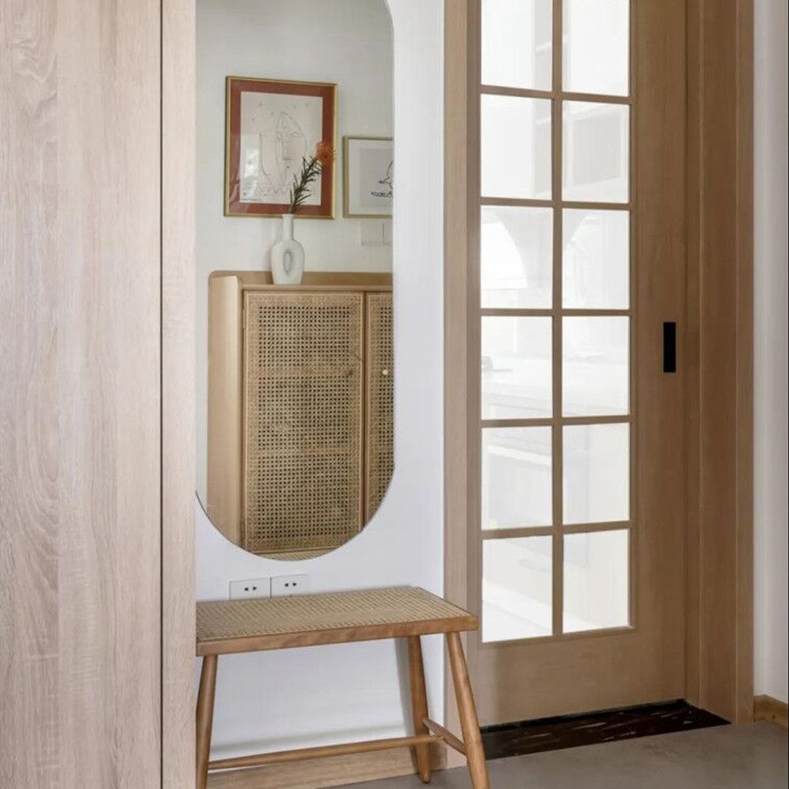 日式清新玄关,一面椭圆形的无框镜,一个原木色的换鞋凳,门是带磨磨砂玻璃的门,这样子的日式玄关看起来非常清新怡人哦!
