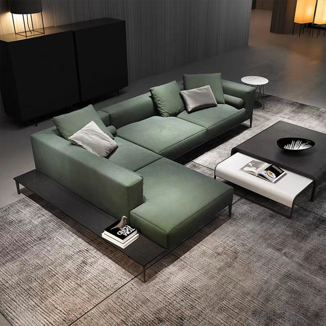 删繁就简的设计营造出了空间的时尚感,灰调的硬装令客厅变得大气有格调。绿色的意式沙发自然的成为了空间的主角,皮艺的茶几和大理石边几点缀,金属、皮艺与大理石的搭配,赋予客厅高级感,契合整个空间的轻奢格调。