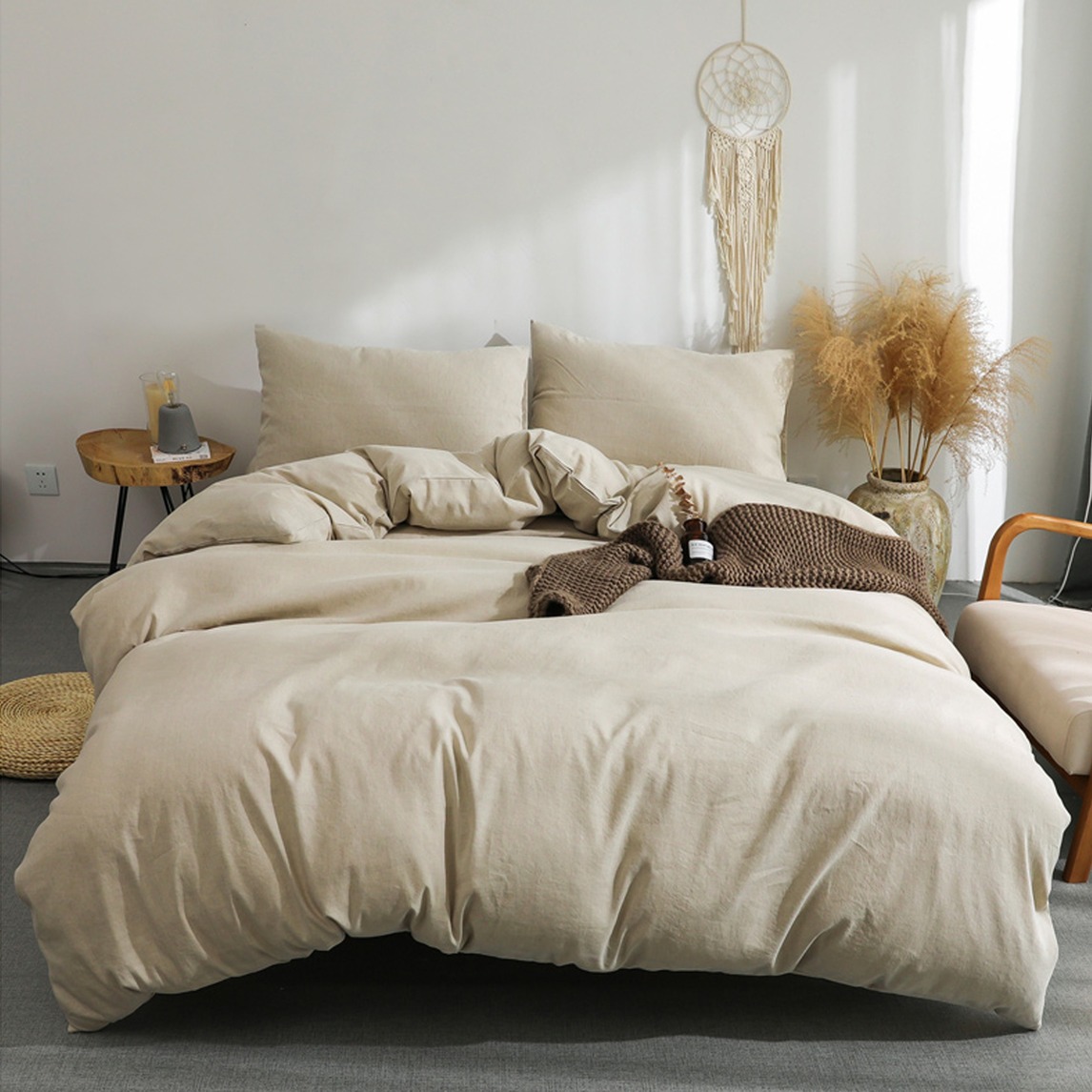未经染色采用纱线制作而成的四件套,呈现了一种亚麻的自然色泽,散发出一种复古自然随性之感,加之芦苇干花以及手工编织的捕梦网的搭配,轻松装点出一个复古风十足的卧室!