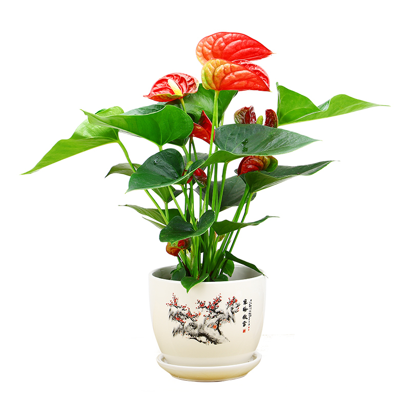 红掌盆栽,花穗奇特旖旎,叶绿花红,点缀家居,可保持数月之久,故有“世纪盆花”的美誉;寓意红红火火,大展宏图,气候条件适宜,可四季开花不断。
