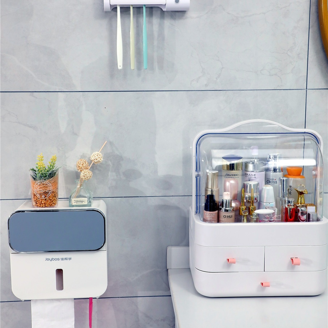 浴室收纳,这样看上去很舒适,抽纸这样收纳干净卫生,上面还能放点小东西,化妆品这样收纳起来,整洁防尘节省空间。