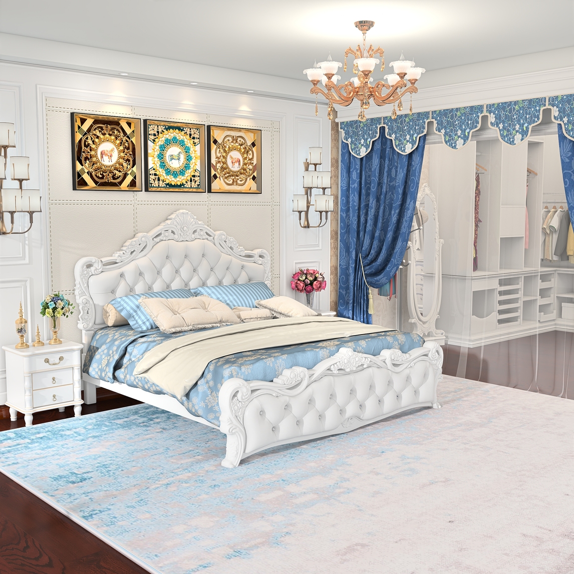 卧室不仅是睡觉的地方,还是享受生活的地方,精致大气的欧式床,高端的背景墙,再腾出一个衣帽间,幸福又温馨惬意。