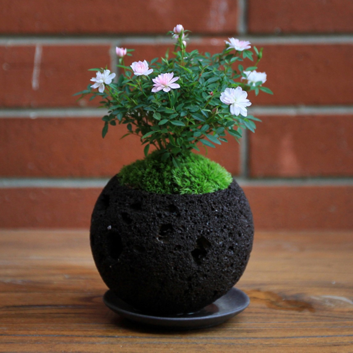 天然火山石多孔,色泽深沉,辅以苔藓铺面,用来栽种姬月季,非常的吸精。小巧迷你的身材摆放在办公桌上非常的亮眼。
