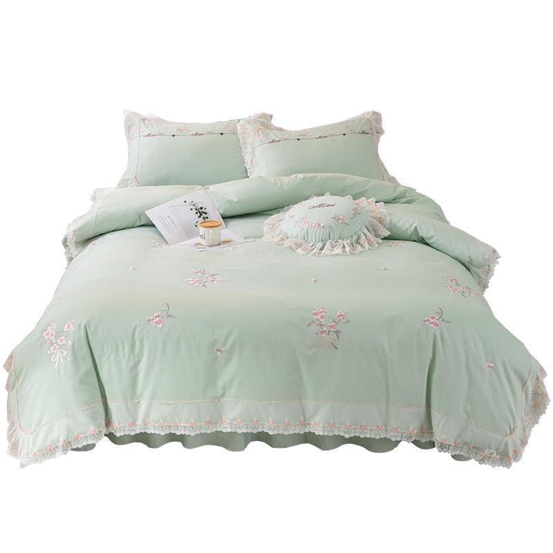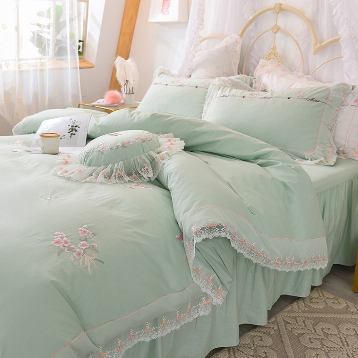 素雅的淡绿色,搭配纱织蕾丝围边装饰,充满文艺小清新的气质。被面上立体刺绣的小花,时尚精美,让卧室成为专属的少女空间。