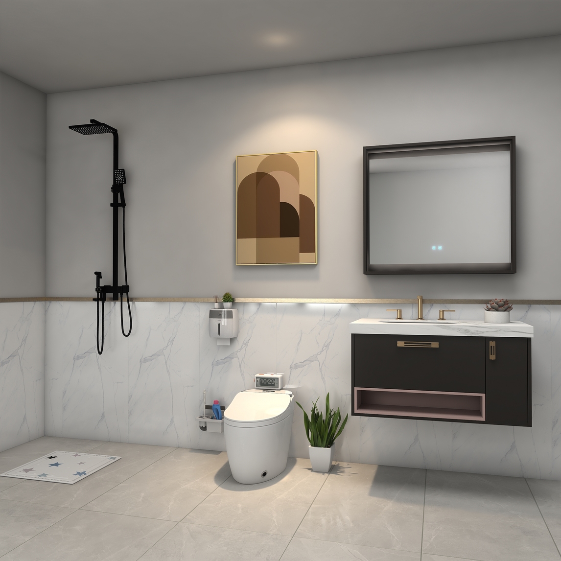 有着黑白灰层次感的卫生间(E)---白色瓷砖墙裙高级奶灰色墙面标得出莫迪兰色彩的高雅风格。配有黑色的卫浴设备层次感凸显。