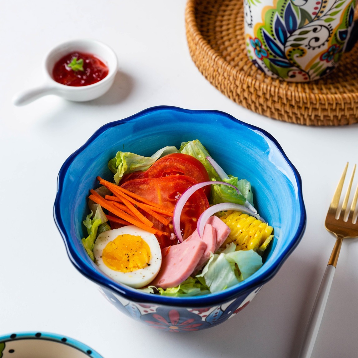 不同于常见的某种特定风格,将热情的波西米亚风,和清新自然的ins风相结合,碰撞出与众不同的格调。明亮的色彩与手绘图案瞬间将餐厅点亮,简约的藤编托盘来平衡,搭配美食拍照很有独特味道。