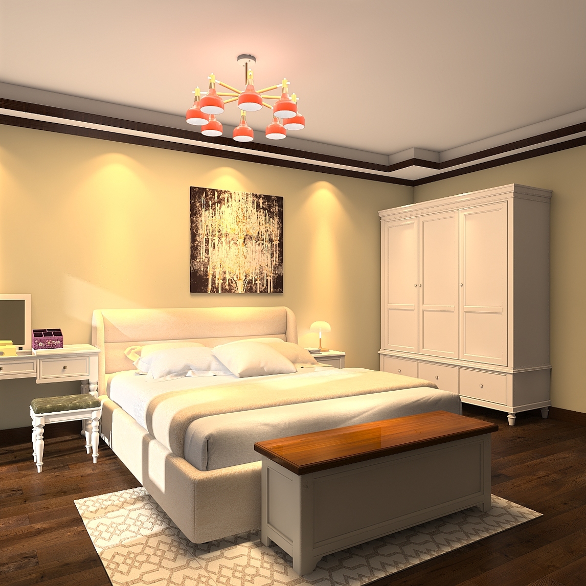 美式风格的卧室,总是给人一种自由自在的感觉,在这里可以体会到家的温馨与自在,浅色系的家具搭配上清新的挂画,让卧室显得更加温馨,