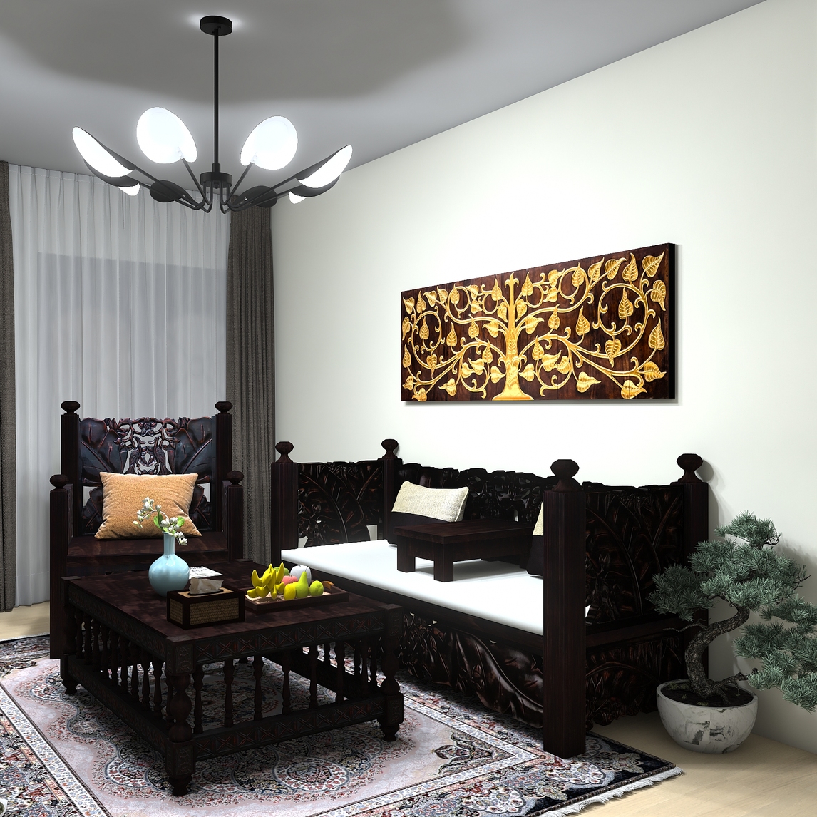 客厅的光线充足,白墙让空间看上去更加敞亮舒适,全屋的实木雕花沙发、茶几都是统一的深色调,透露出成熟稳重的质感,金箔菩提壁挂更显奢华和大气,简单的搭配就能让自己体验高大上的生活感。