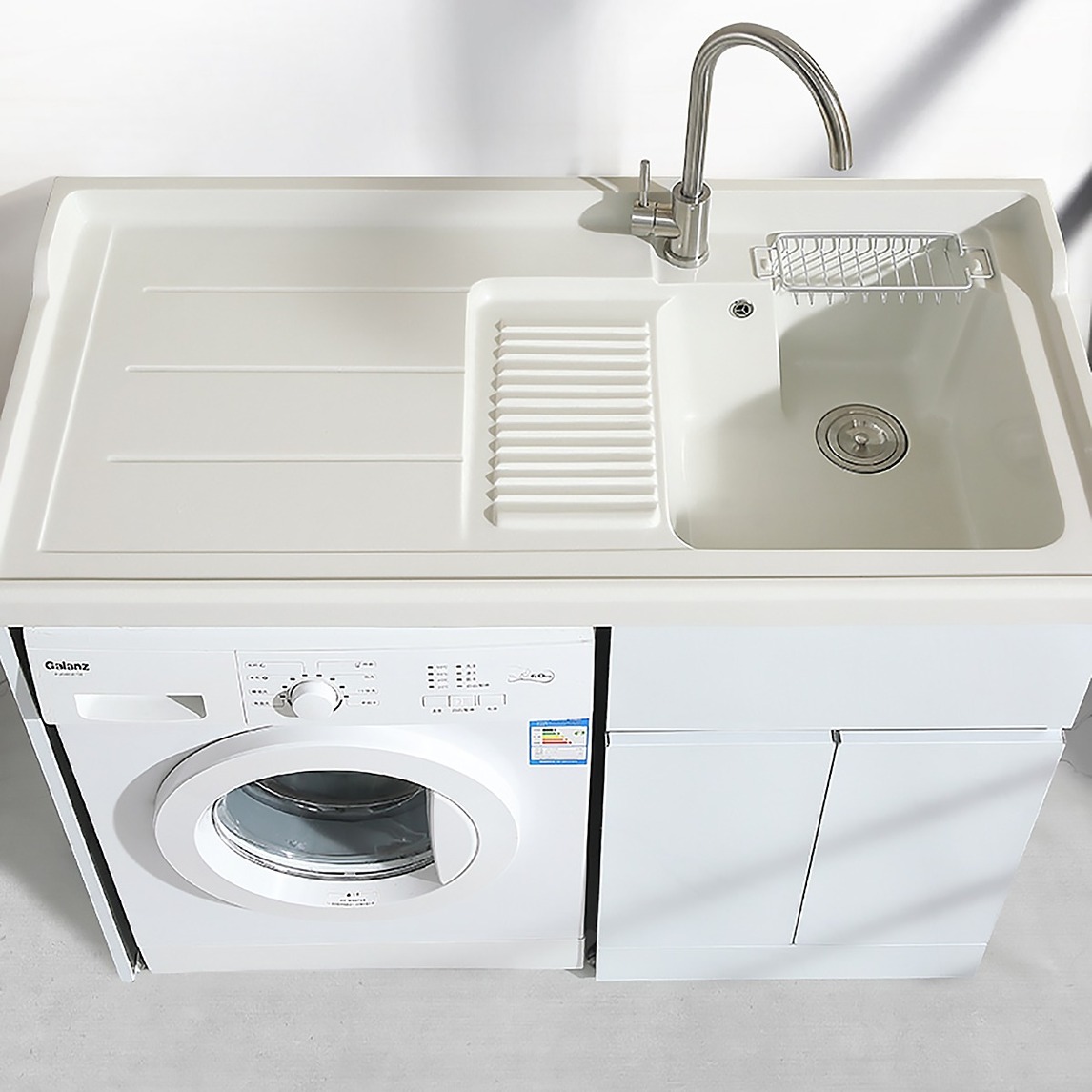 轻松洗衣攻略,当阳台遇到浴室柜。站着洗衣腰不累。耐用石英石台面。大容量洗衣池,操作空间大,洗衣更自由。多功能台面,轻松洗衣。