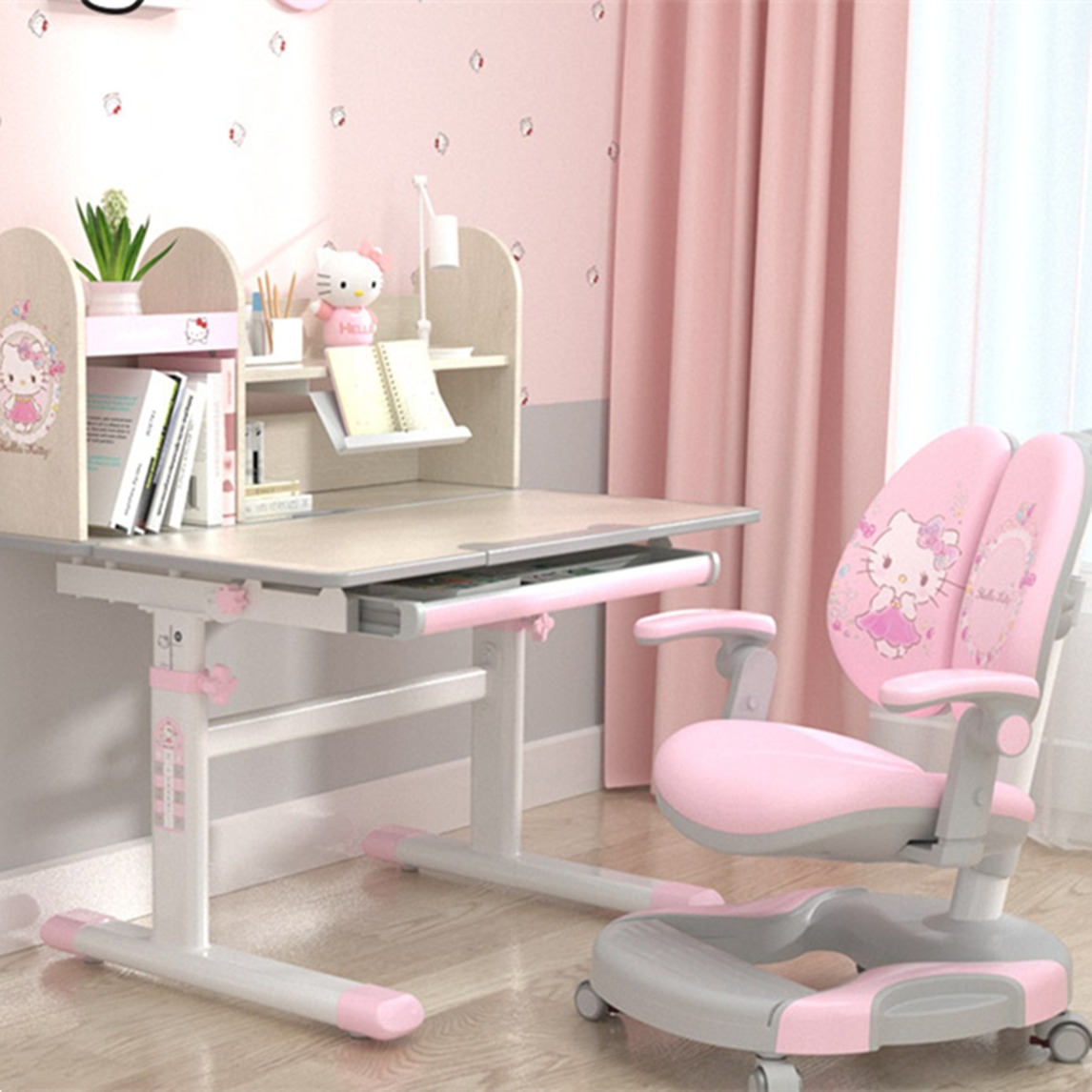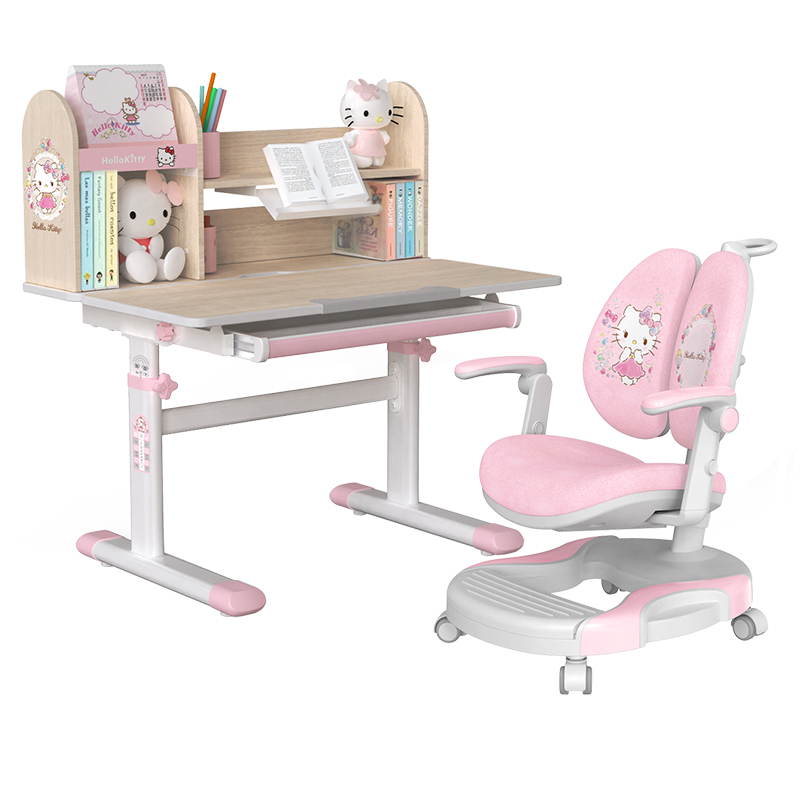 这套可爱风的桌椅是多功能的,专为小女孩量身定做的,粉色的椅子上还有可爱的HelloKitty图案,而且这椅子还可以矫正身姿,桌子的高度是可以升降的,适应孩子不同的年龄阶段,搭配粉色的墙纸,满满都是可爱...展开