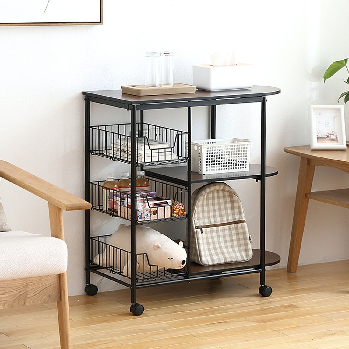 要知道小巧不占地方的置物架是客厅收纳好帮手哦,摆在墙角填补空白区域的效果也不错,而且它轻便易移动,可以根据自己的需要随时挪动到需要的区域。