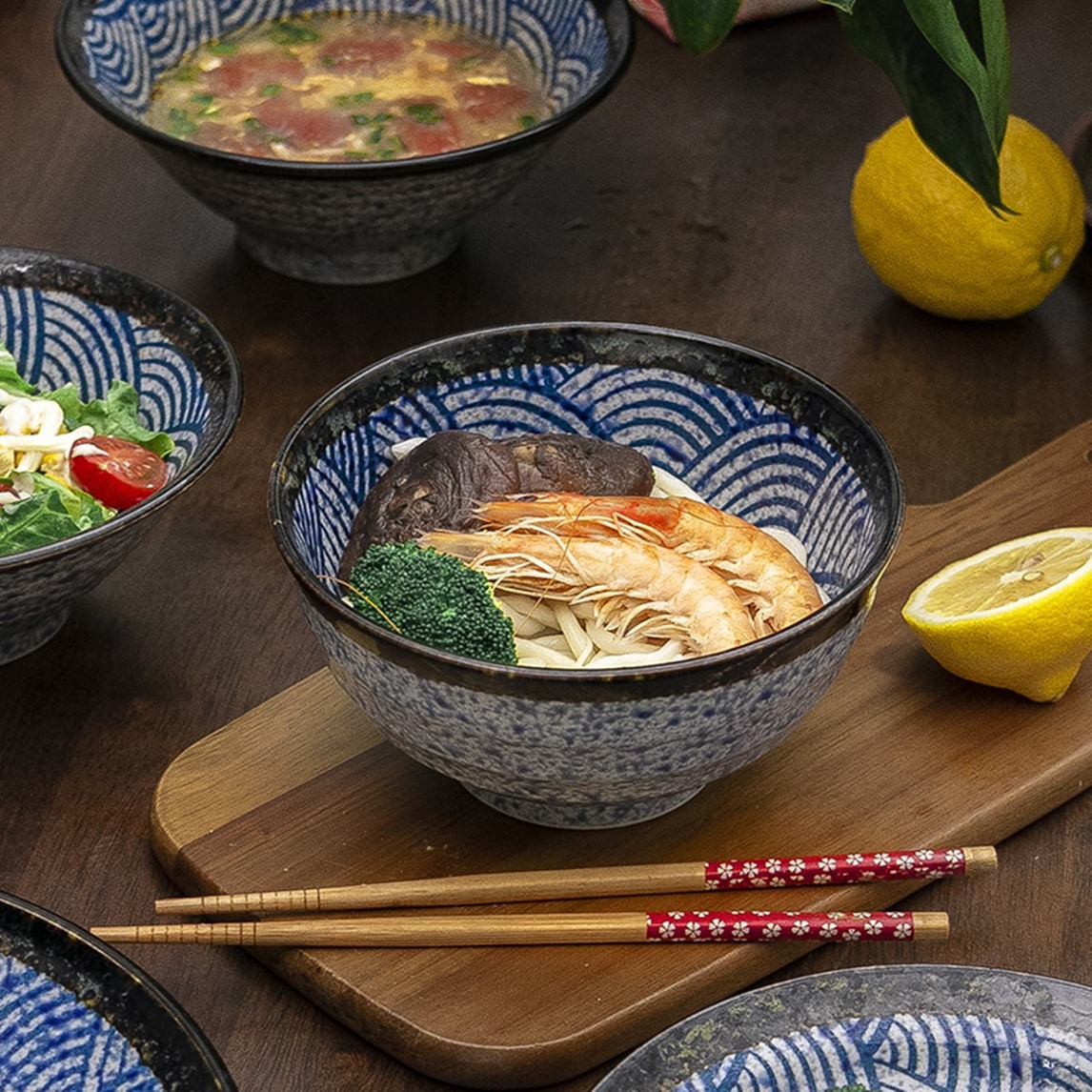 海波纹系列的日式风套装,细腻白胎,高温烧瓷,浪纹藏于釉层之下,碗外壁青蓝釉溅点,凹凸浮雕,质感古朴自然。