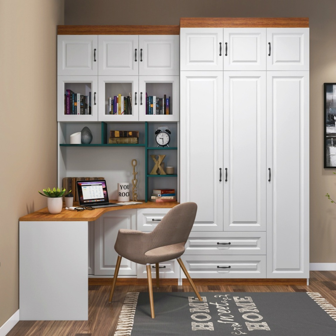 免漆环保实木颗粒板,耐高温耐腐蚀,不容易刮花,无异味无甲醛,吸塑门板,美观大方更立体,书桌底部5层抽屉,海量储存,拿取方便,大容量衣柜,学习储物两不误!