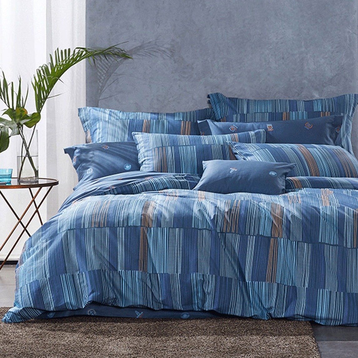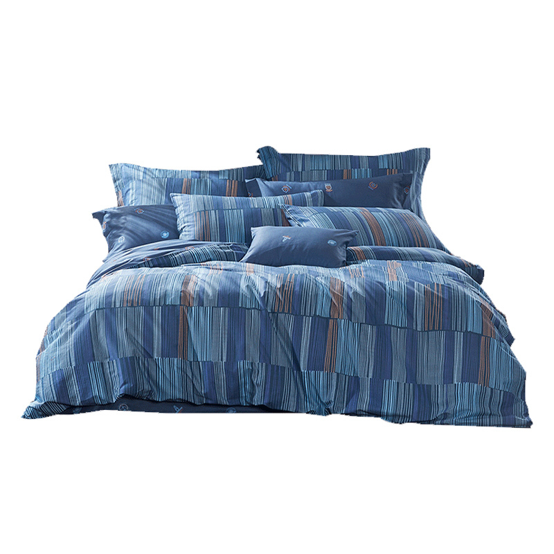 罗莱全棉四件套,梦回常春藤。深蓝色的底布上,浅蓝色和浅黄色的线条穿插排放着,看似凌乱实则工整,彰显简约,时尚大气。