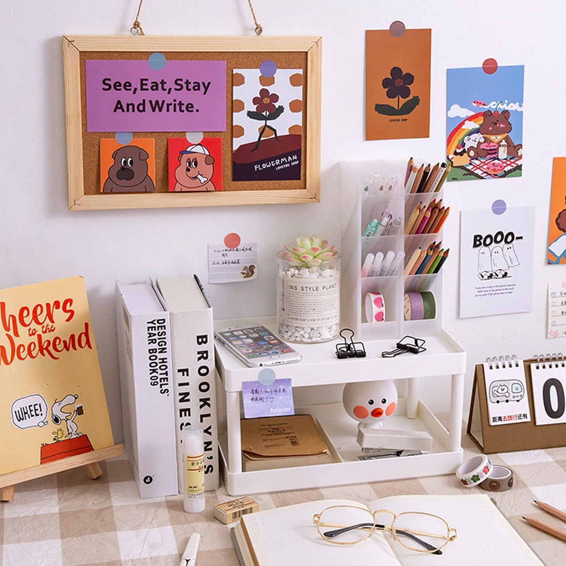工欲善其事,必先利其器。开始整理书桌之前需要一些收纳工具。磨砂透明的收纳盒可以分层摆放不同小杂物,钢笔、水性笔、画笔......都全部整理到这个盒子里。