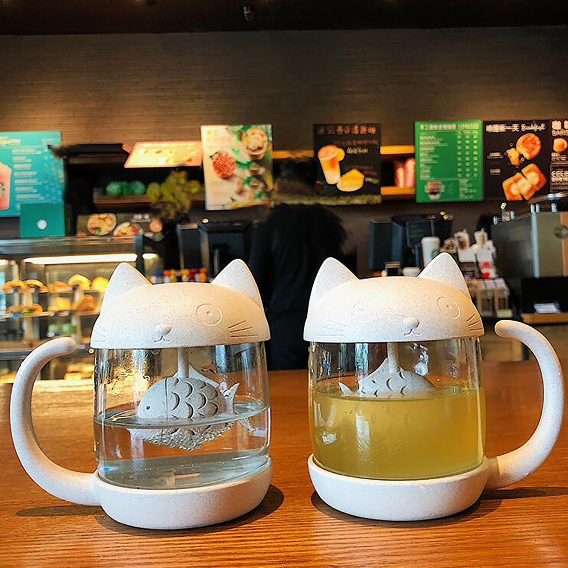 这是一个猫咪小鱼茶杯,泡茶的时候,茶水分离效果非常好,因为这条呆萌的鱼其实是个过滤器,拆开之后可以在里面放花茶,茶包等,过滤之后再喝茶,喝得更惬意哦。