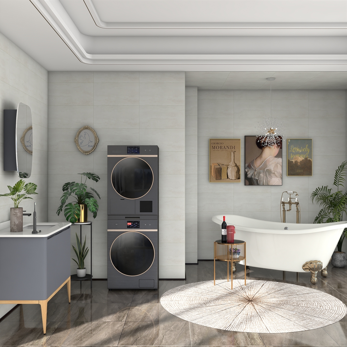 复古轻奢风格的卫浴间,由多种元素共同打造,花纹的地面和墙面,简约时尚的洗手台,造型别致的浴缸,复古风格的装饰画,展现高端的生活品质。COLMO洗烘套装,星泽灰的色泽和金属质感的外观,给卫浴间增添了时尚...展开