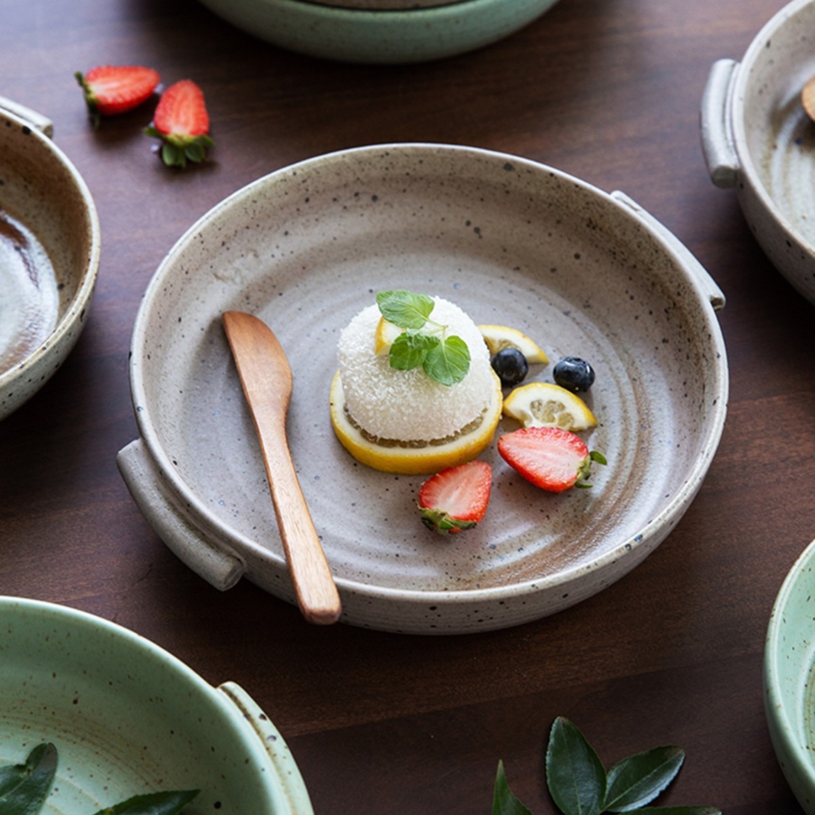 手工造型细腻陶泥手工造型,纹理感浓厚,日式风格,美食和美器不可分离,双耳设计,淳朴灰色粗陶质感,手感舒适。