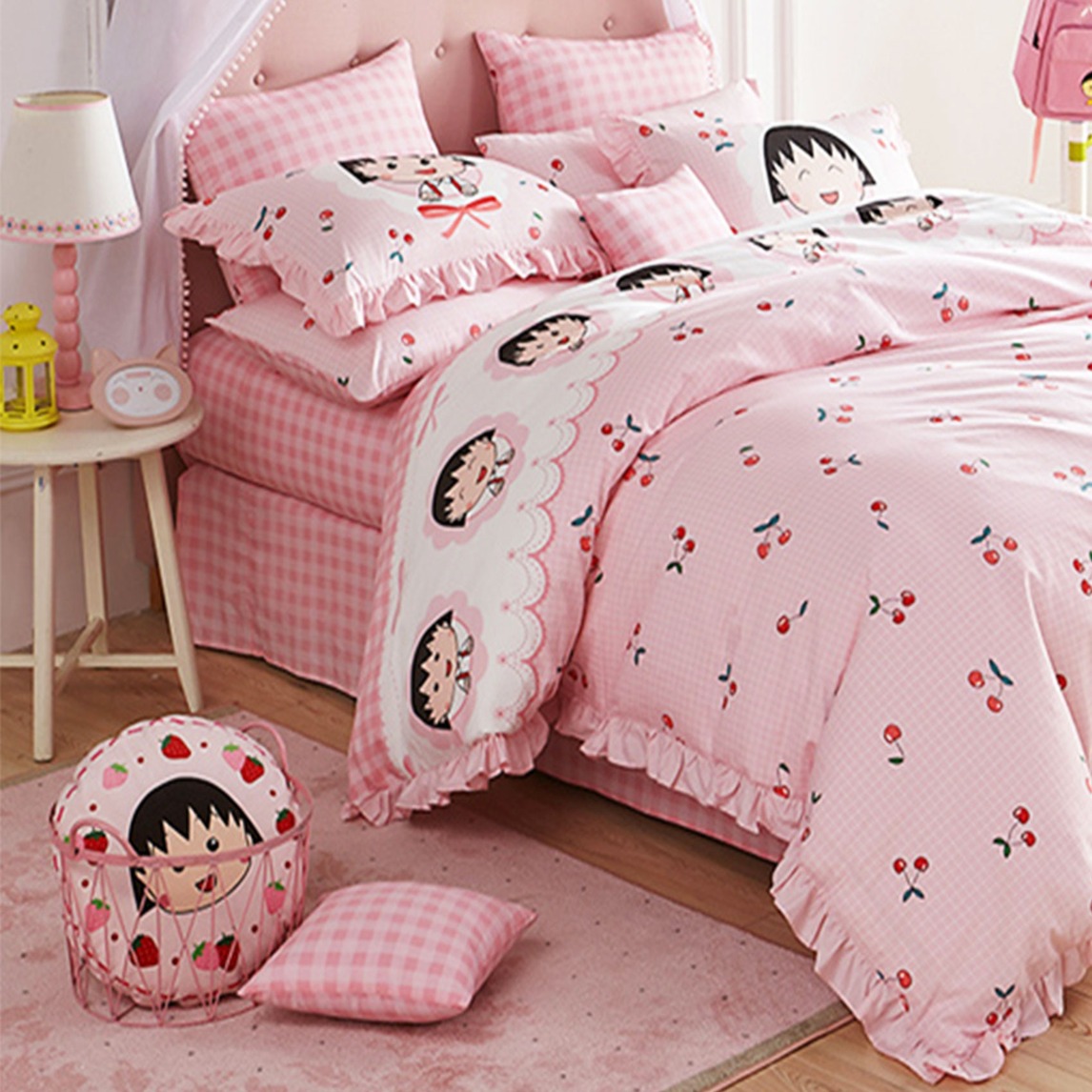 甜甜樱桃,上半段可爱小丸子头像,搭配蝴蝶结花边,下半段软萌粉红格子上甜甜樱桃点缀, 全面打造粉嫩公主风。