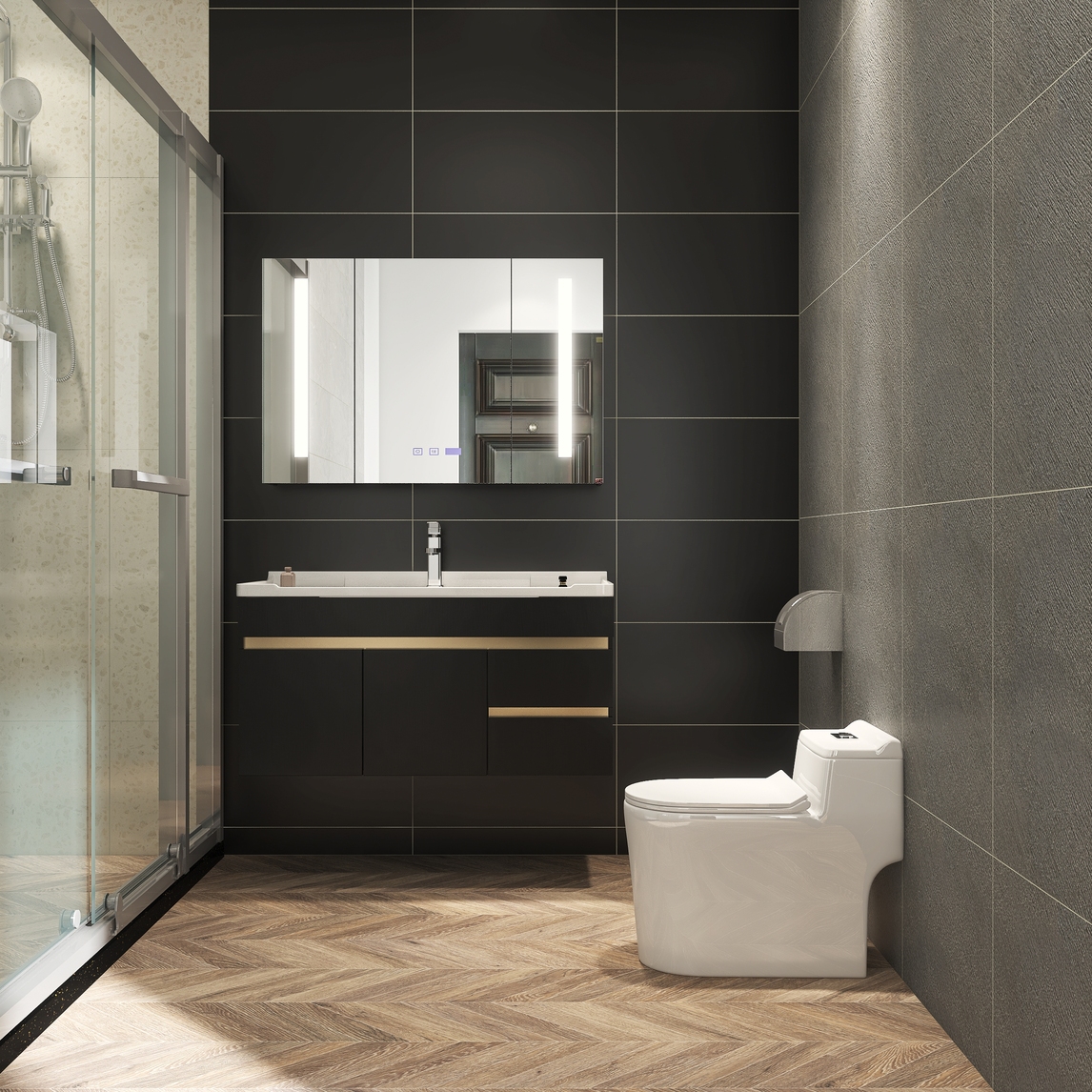 此款卫浴恰恰是黑白格调的卫浴间,金色在黑色的点缀下更突显气质,墙面是以灰色调格子作为墙面装饰,挂壁式洗面台亦是很好的装饰物,同时,以地面的木纹作为空间装饰,使空间设计感更强,装饰更显丰富。