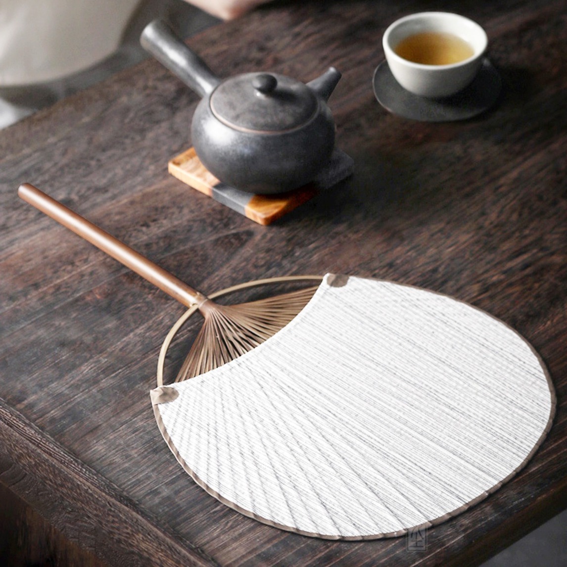喜欢充满禅意的茶室,除了整体选用颜色较深的实木材质家具之外,小件器具的选择也尤为重要。可以在茶室中备上一个复古的团扇,不仅煮茶时可以控制火候,也能激发出阵阵茶香。