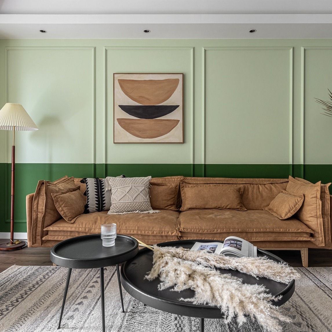 复古绿的拼色背景墙,优雅不失气质的落地灯,配上复古感满满的科技布沙发,简简单单的几件家居,轻松营造出优雅不失复古气质的客厅空间。
