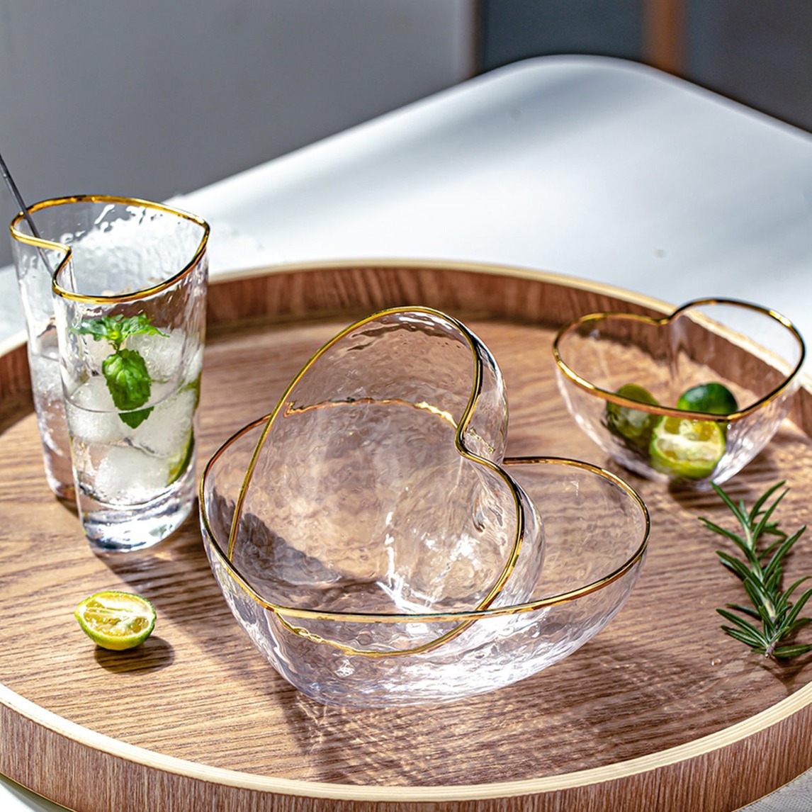 清新玻璃搭配亮色金边,优雅迷人,盛放各式水果或者沙拉,摆盘四方上镜。金边描边,轻奢有格调。锤目纹理清晰富有肌理感。