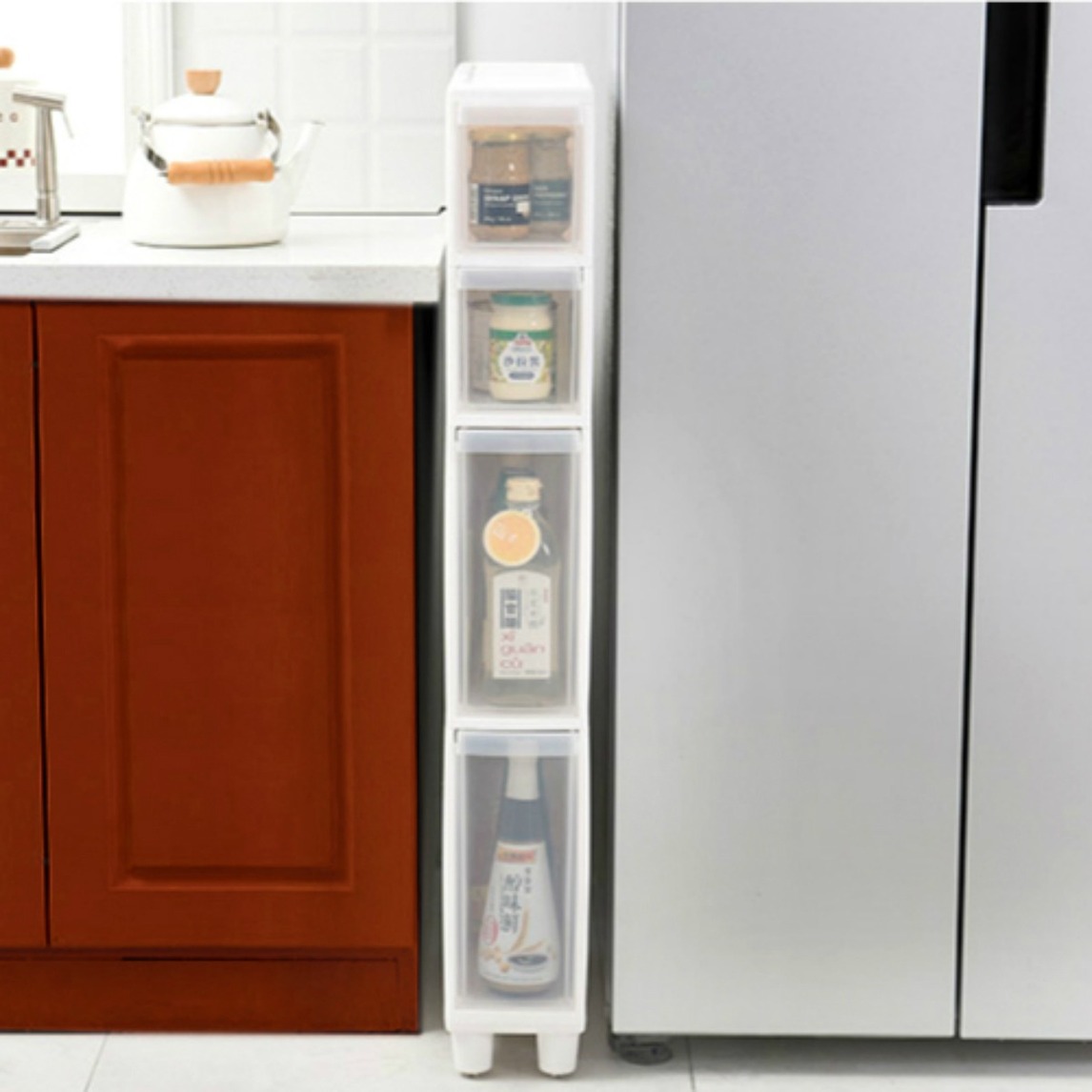 夹缝置物架,超窄设计,可以放进夹缝里,让空间得到充分利用,带滑轮,推拉方便,抽屉式储物格,安全又好用!