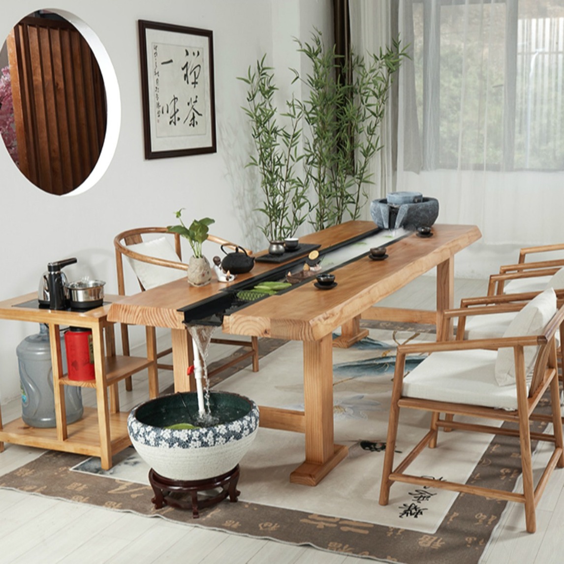 景观流水茶桌,不锈钢流水槽、厚实的实木框,保留了中式家具的韵味同时保留了中式家具的韵味,结合现代人向往的简约,给人淡淡的禅意中式风格,线条简约,造型雅致,独具韵味。
