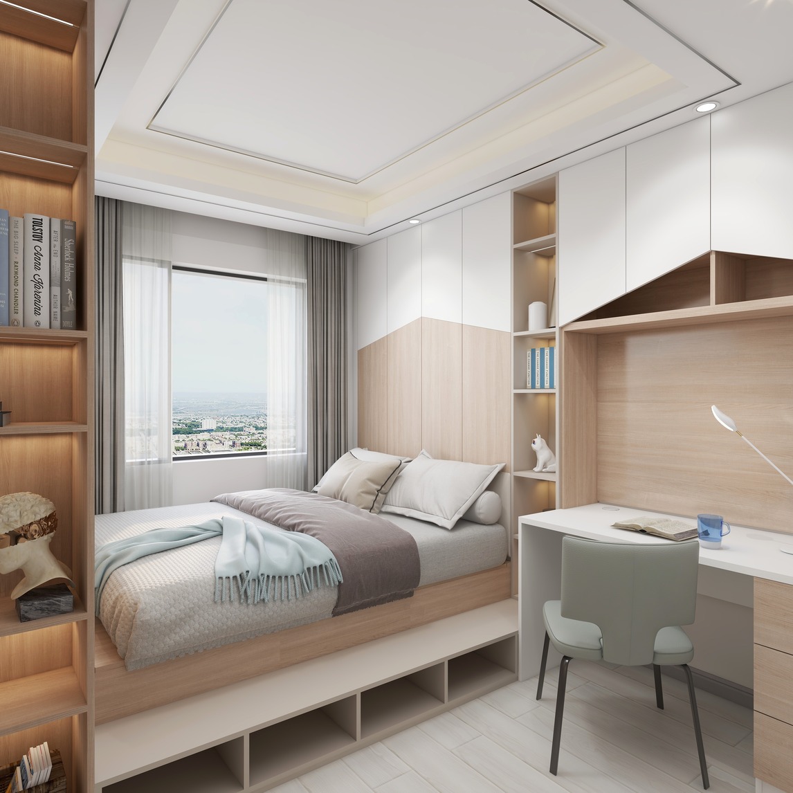 榻榻米床+书桌+衣柜,创造了大量的储物空间,又能实现个性和休闲的家居氛围,定制柜体结合桌面,来提高整个房间的使用机能。