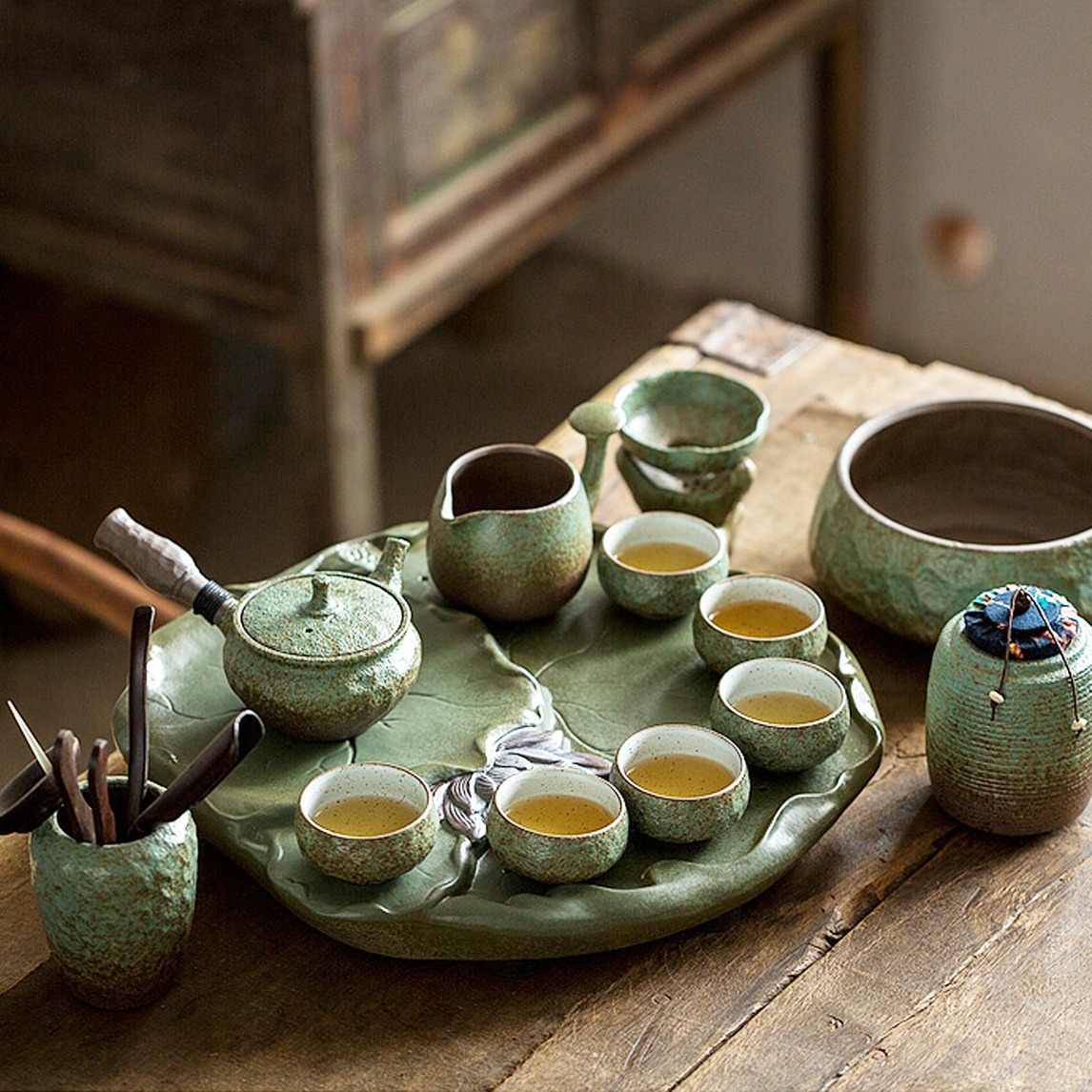 日式创意荷叶莲花茶盘套装,茶具的花样别具一格,颜色的古色古香,衬托出非常有品味的茶具,功能和颜值都在线。